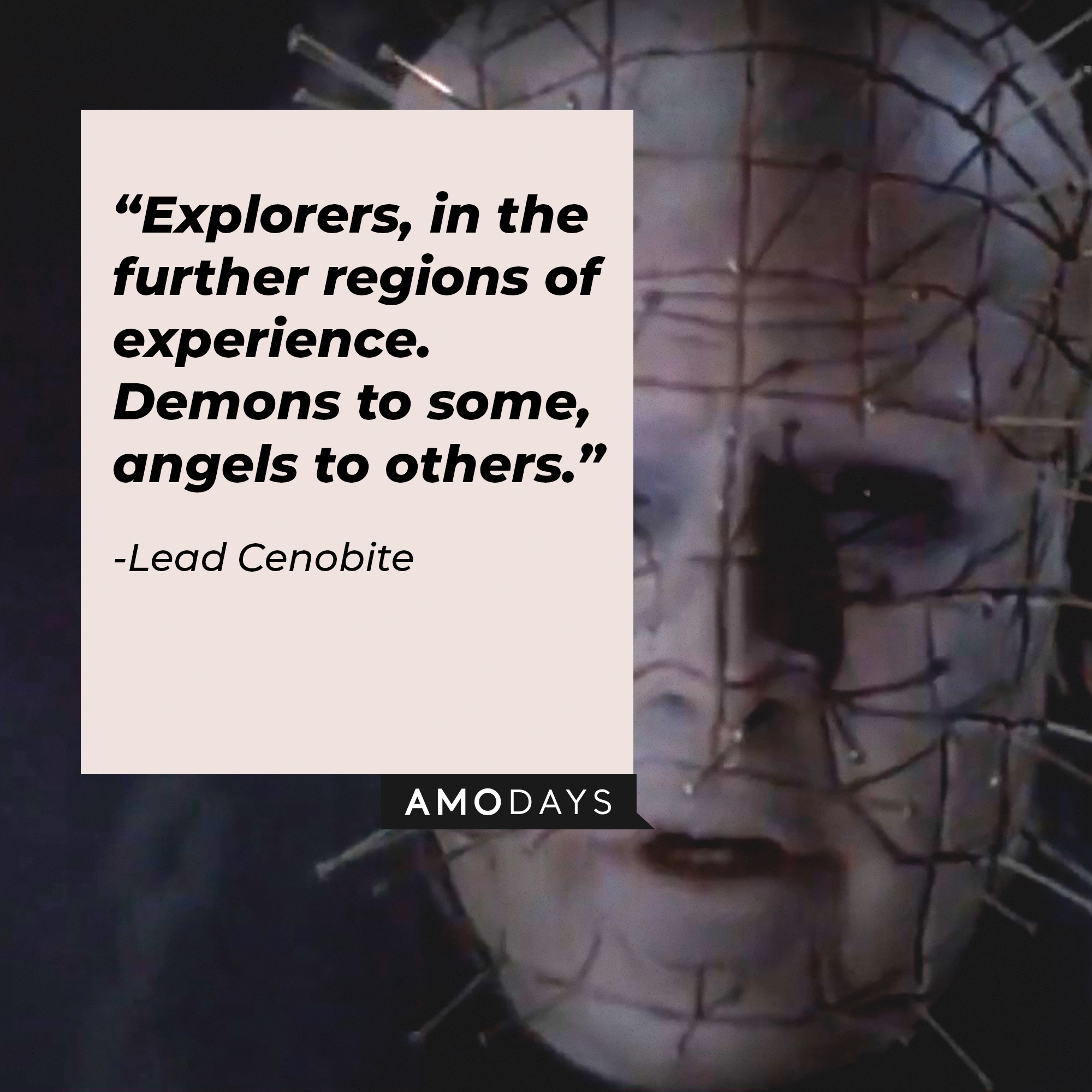 A picture of Pinhead from “Hellraiser” with a quote by Lead Cenobite” that reads, “Explorers, in the further regions of experience. Demons to some, angels to others.” | Image: facebook.com/HellraiserMovies